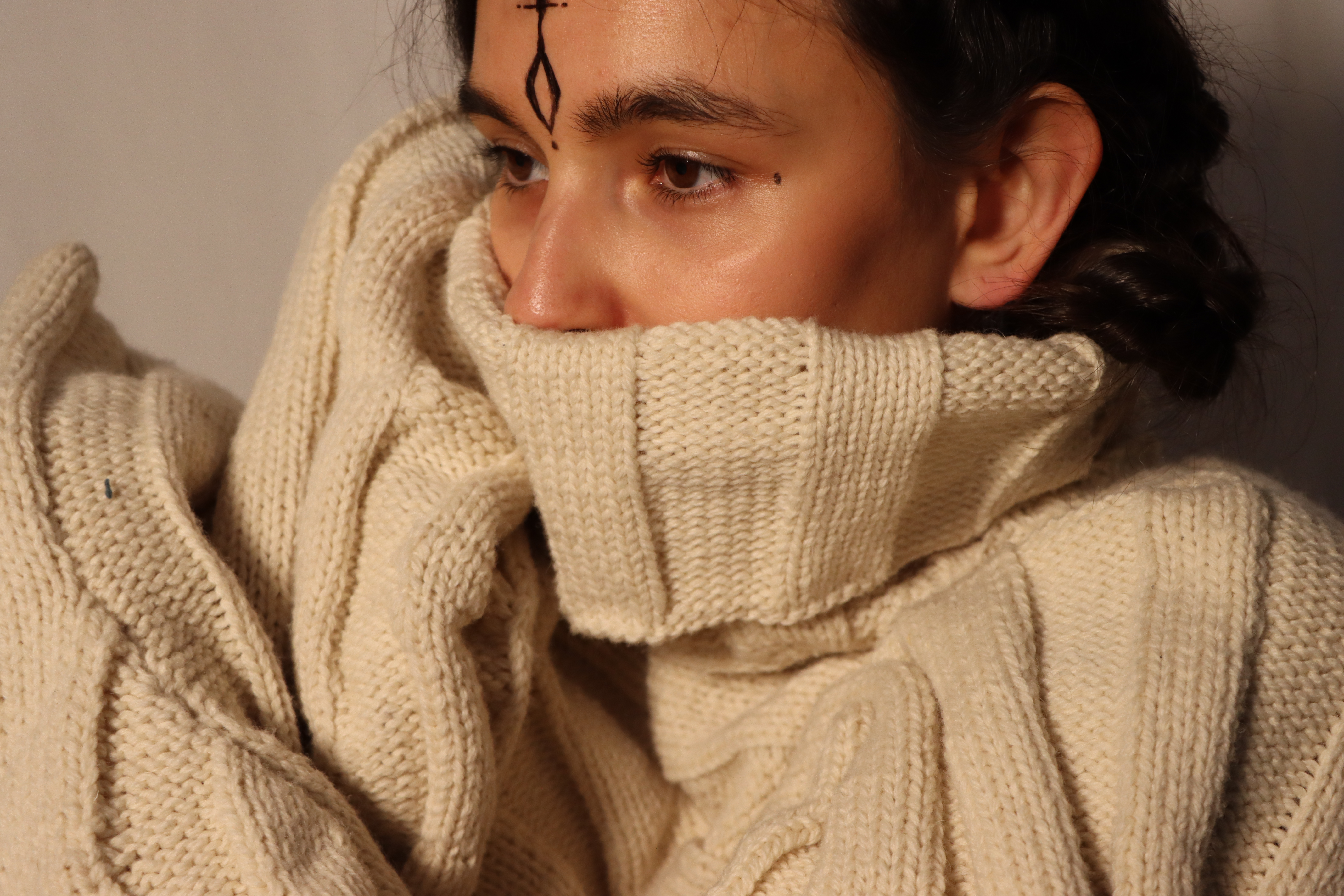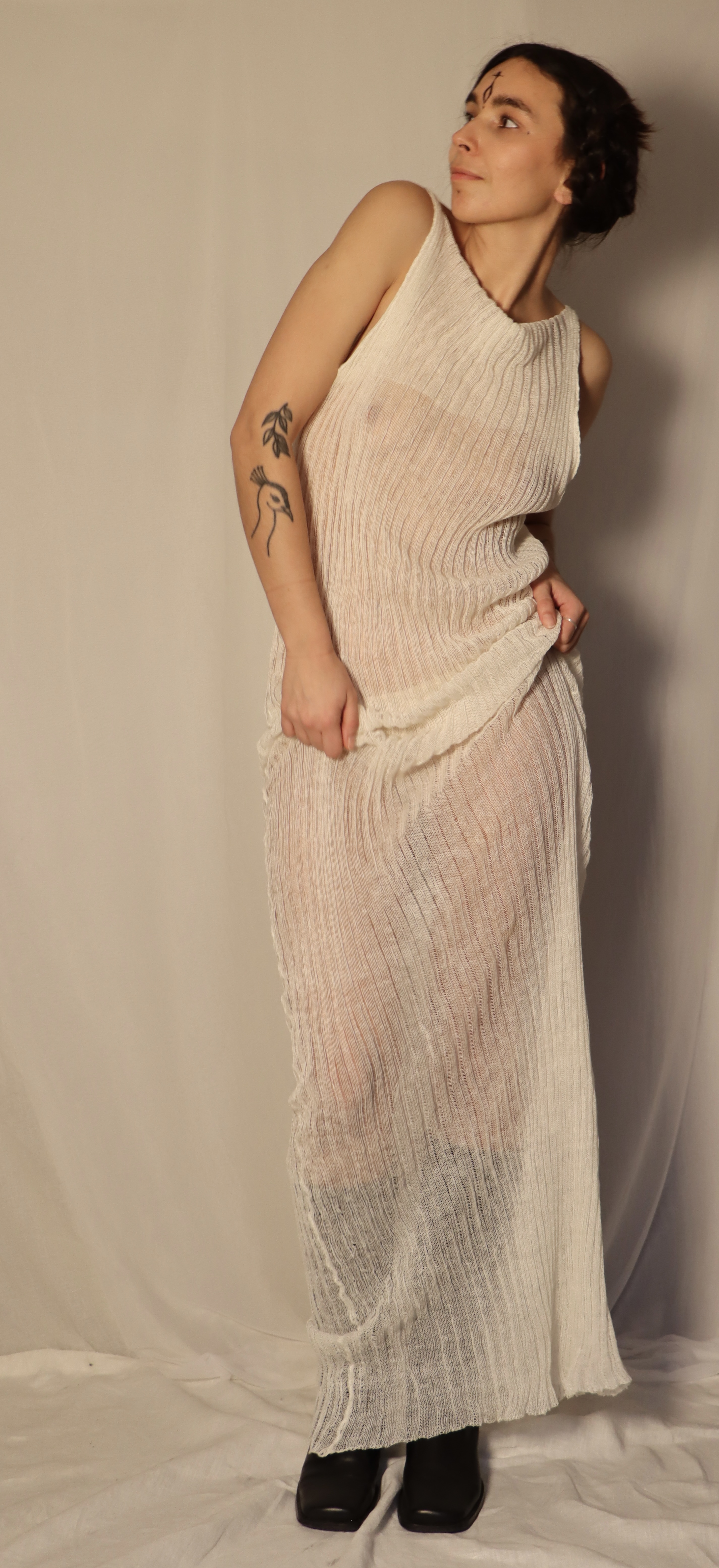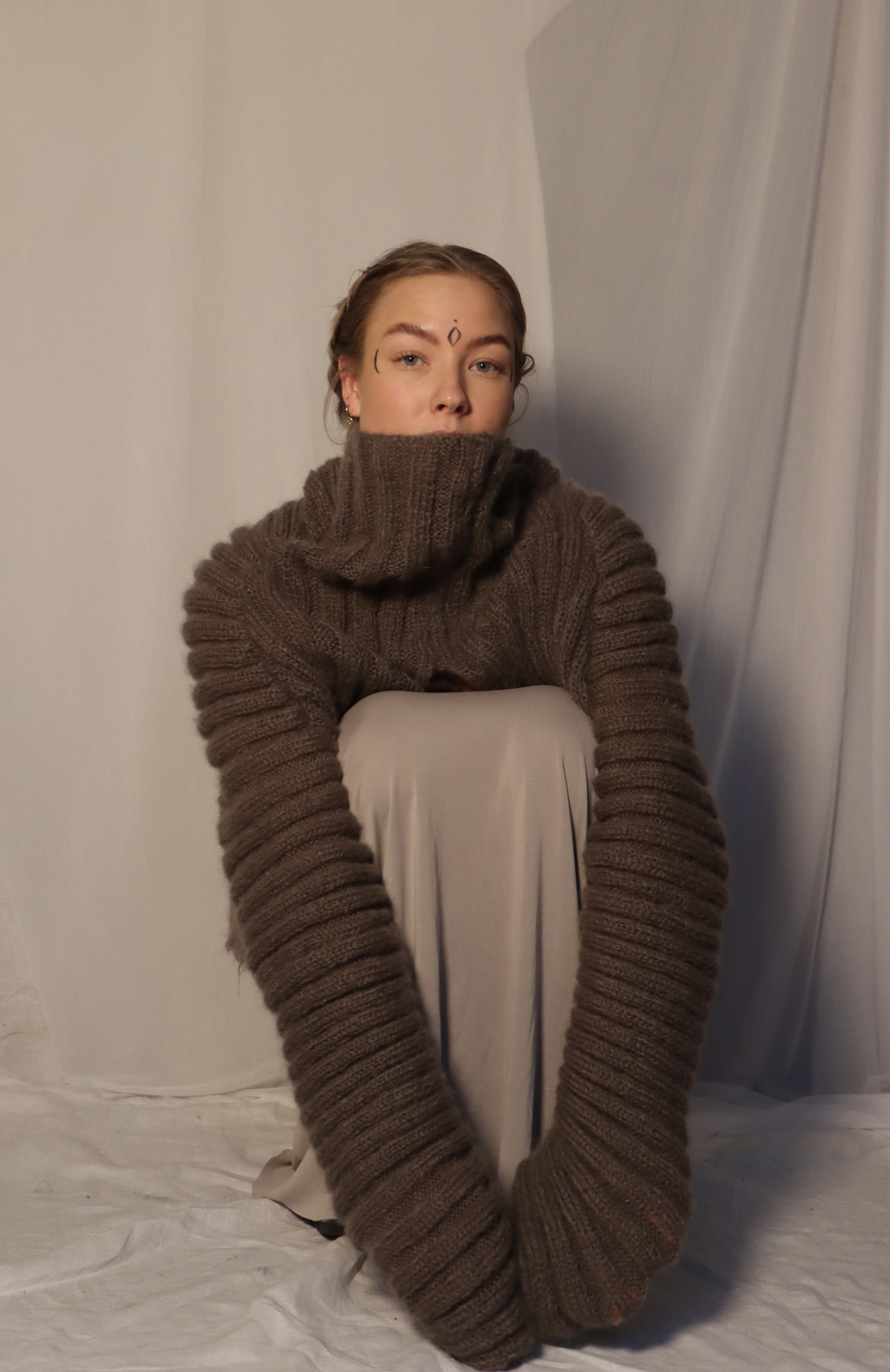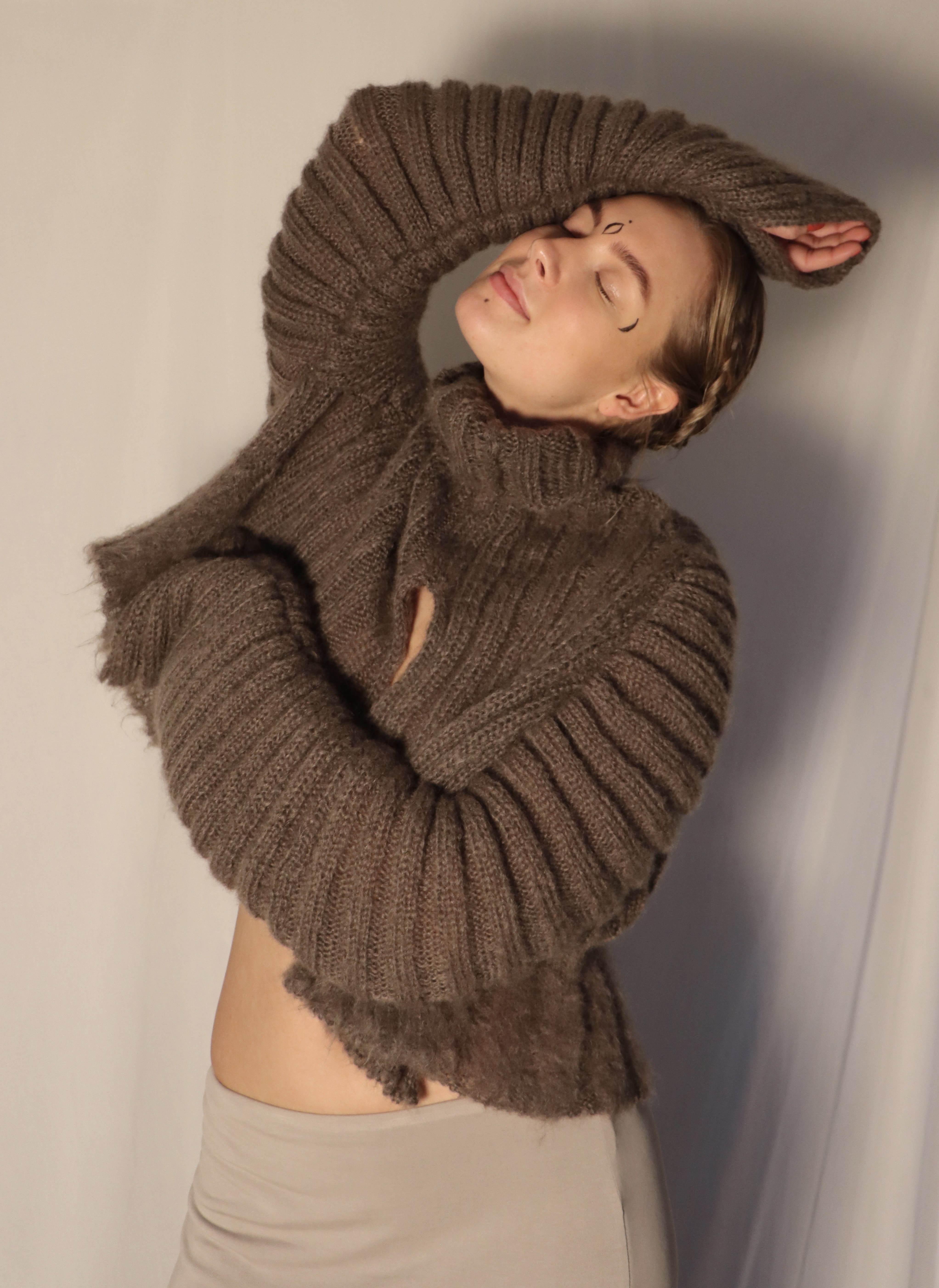 My relationship to knitwear design is the feminine and caring approach, the closeness to the raw material and the soft and organic possibilities of creating shape around the body. I tend to work with waste textures and yarns or all natural materials to give back and treat our planet well. All of my inspiration comes from nature and the stillness I find myself in when listening to her. My Intentions when creating is to trust the process and even though you need quite some skills and structure while knitting, you also have to ease into the flow of the yarn and the knitting machine.